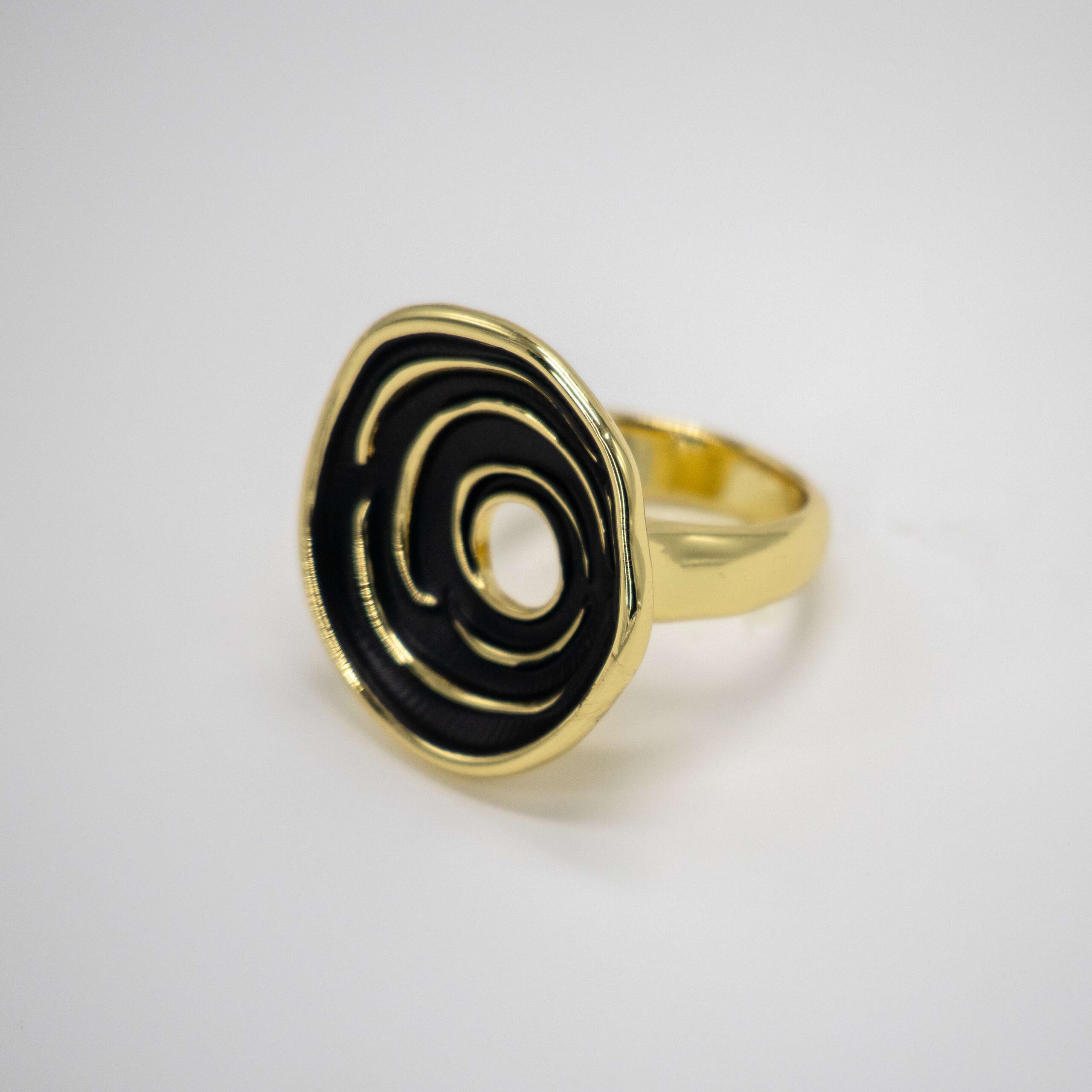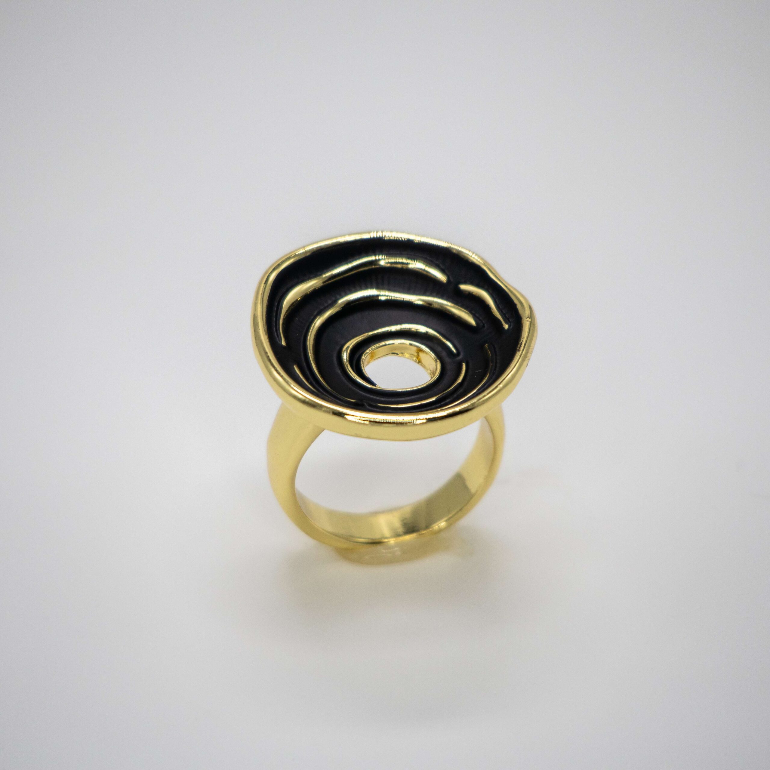 Cerchio is a gold‑plated statement ring characterised by its bold circular crest and refined metallic contrast. The raised concentric ridges create a sculptural, architectural presence that feels both modern and timeless. Its polished finish and elegant symmetry give it a luxurious aura, making it a standout piece for any curated collection.