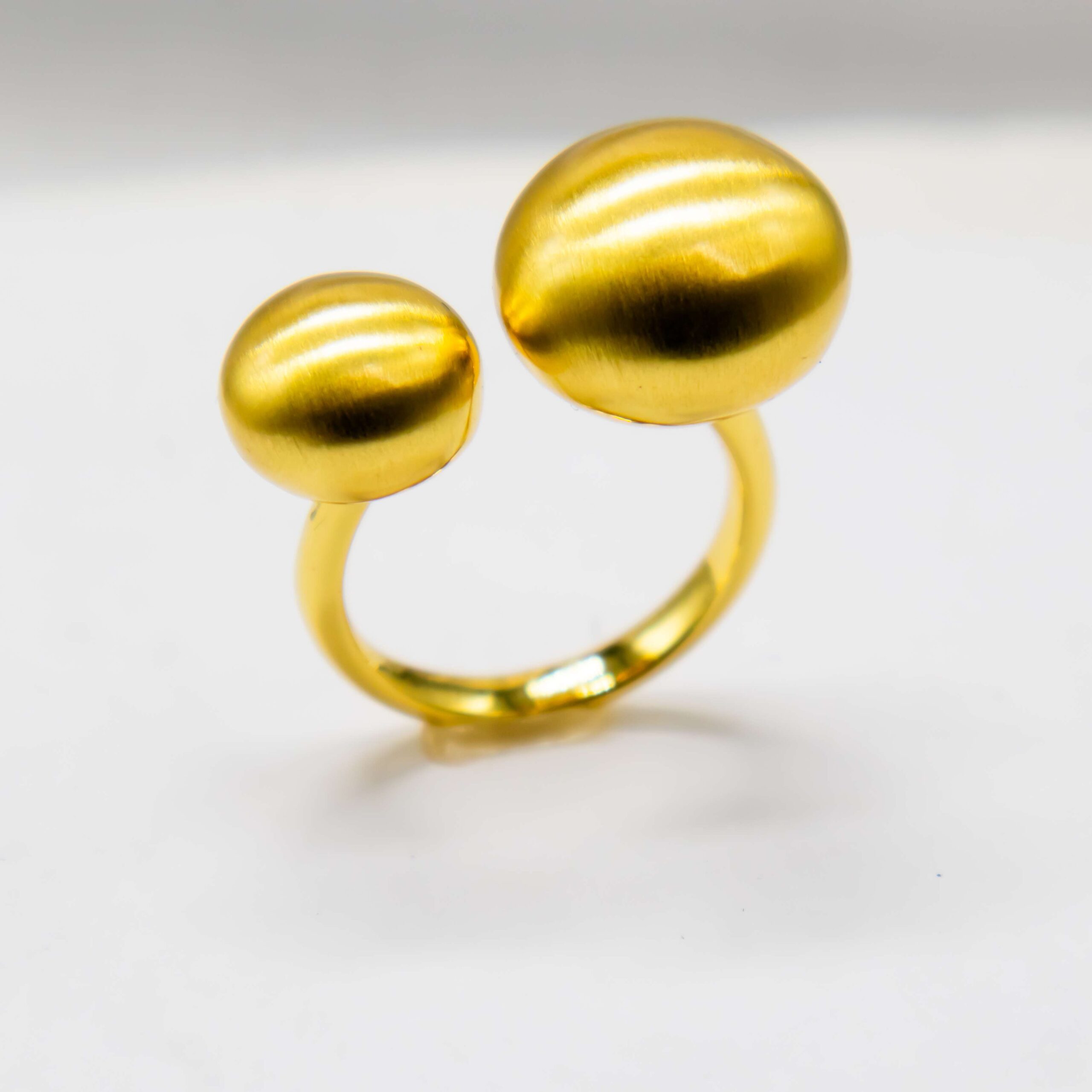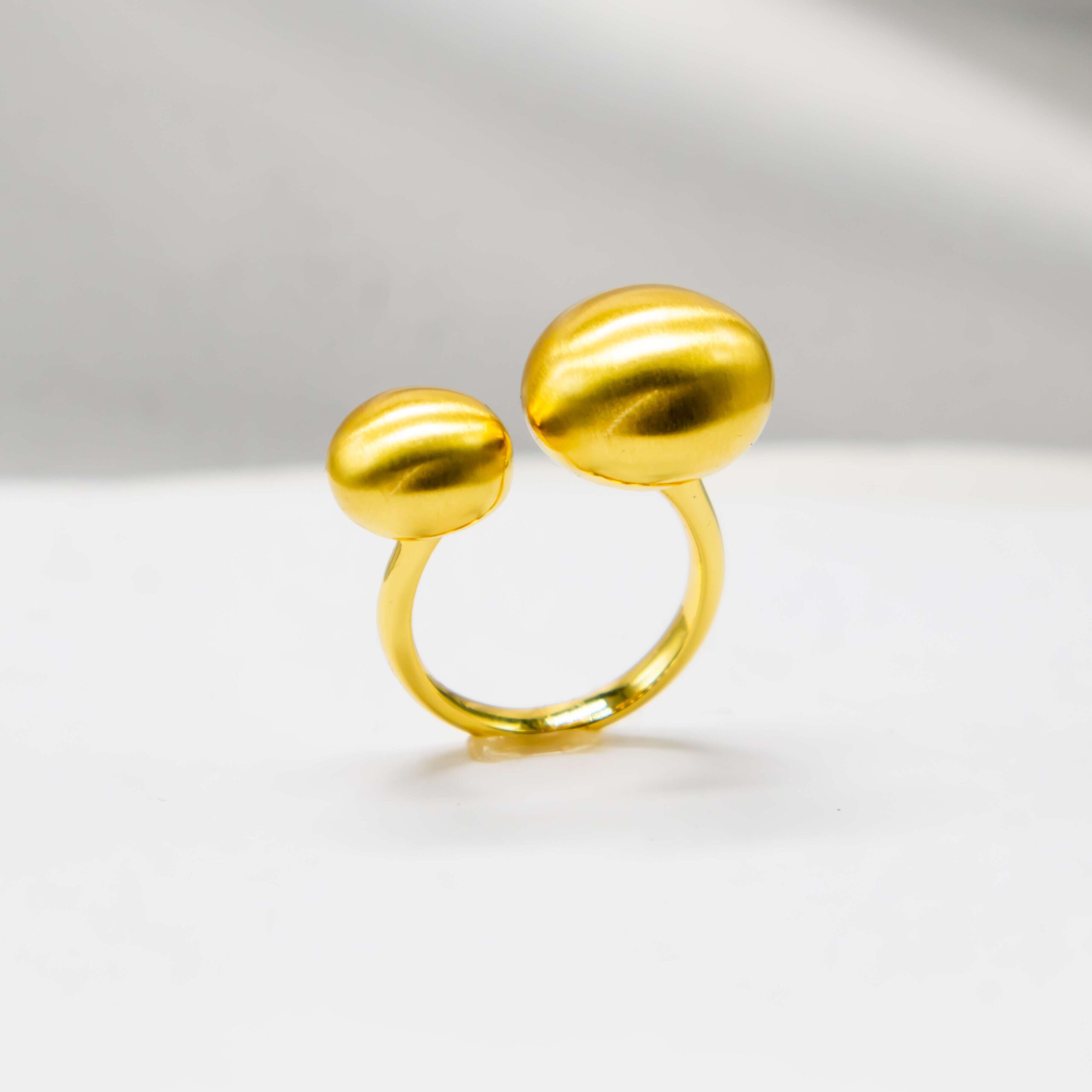 Gemello is a modern gold‑plated ring defined by two softly rounded ends that face each other in an elegant open design. Its velvety matte finish and sculptural balance give it a quiet, contemporary luxury that feels effortlessly refined.